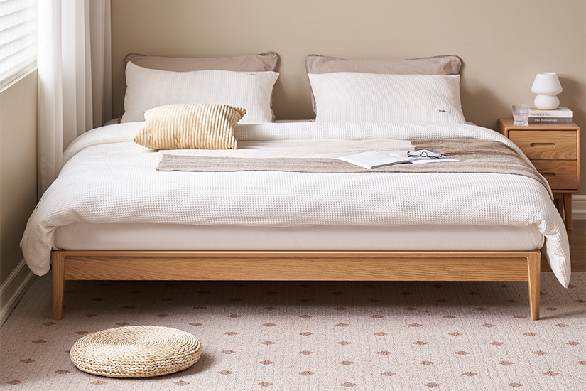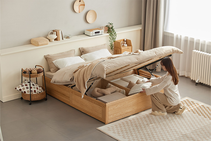 A tatami-style storage bed made from oak is ideal for small bedrooms. It combines sleeping comfort with hidden storage beneath the bed platform, reducing the need for bulky wardrobes.